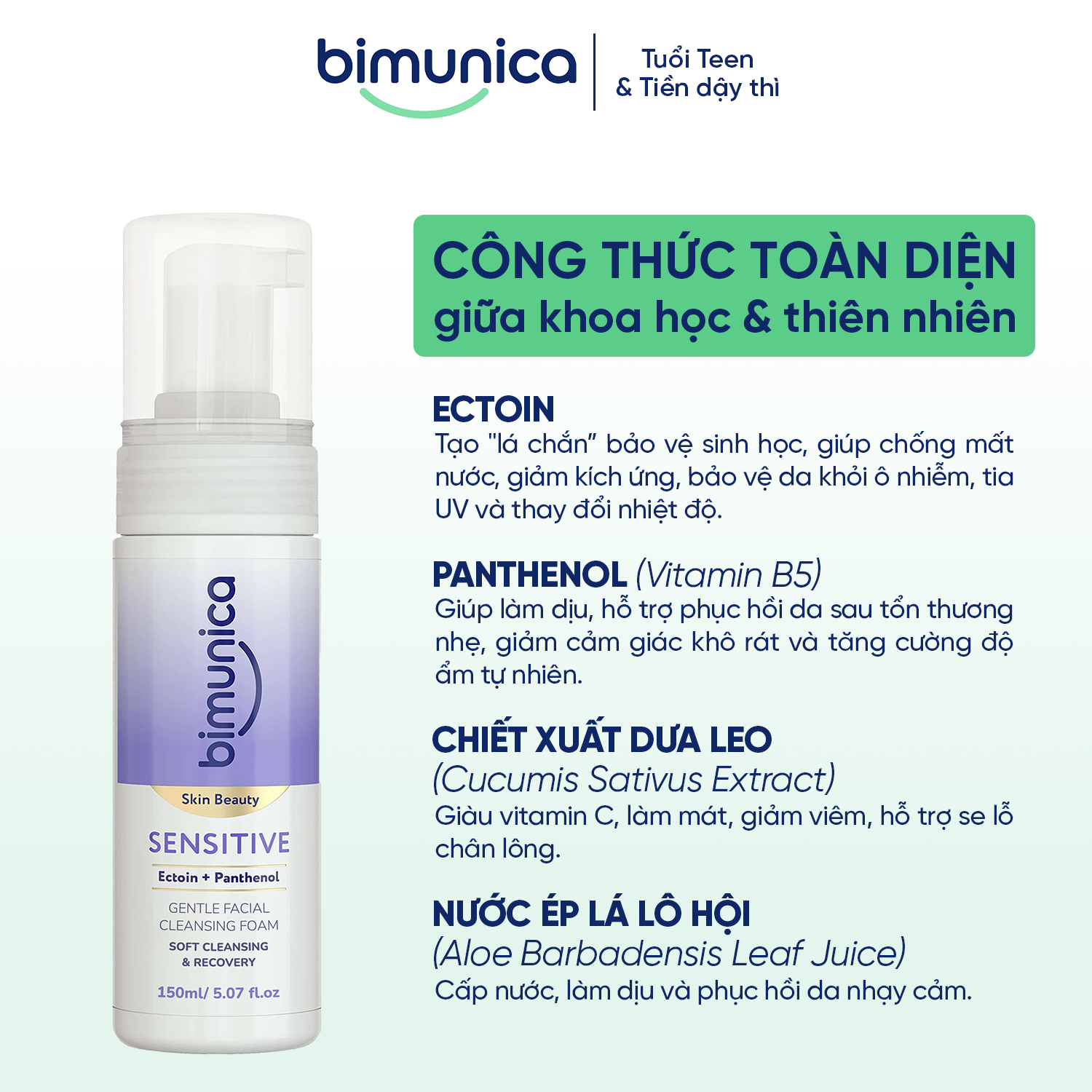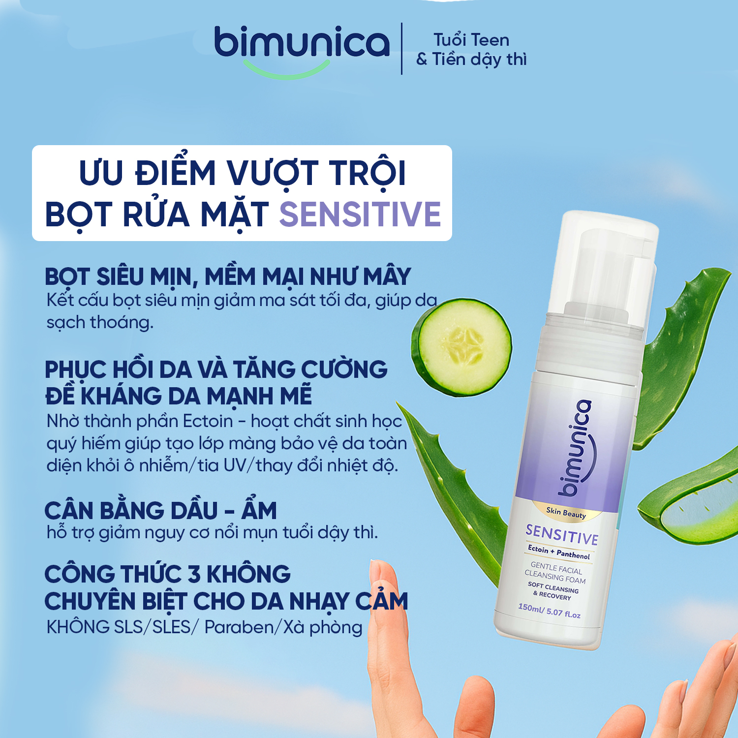 Dành riêng cho làn da mỏng manh, dễ kích ứng của tuổi dậy thì, Bimunica Skin Beauty Sensitive Cleansing Foam giúp loại bỏ tạp chất, dầu thừa và cặn trang điểm một cách nhẹ nhàng, đồng thời cung cấp độ ẩm tự nhiên cho da.Công thức độc đáo chứa Ectoin – hoạt chất bảo vệ sinh học tự nhiên và Panthenol – vitamin B5 giúp làm dịu, phục hồi và củng cố hàng rào bảo vệ da, mang lại cảm giác ẩm mượt và tươi mát sau mỗi lần sử dụng.